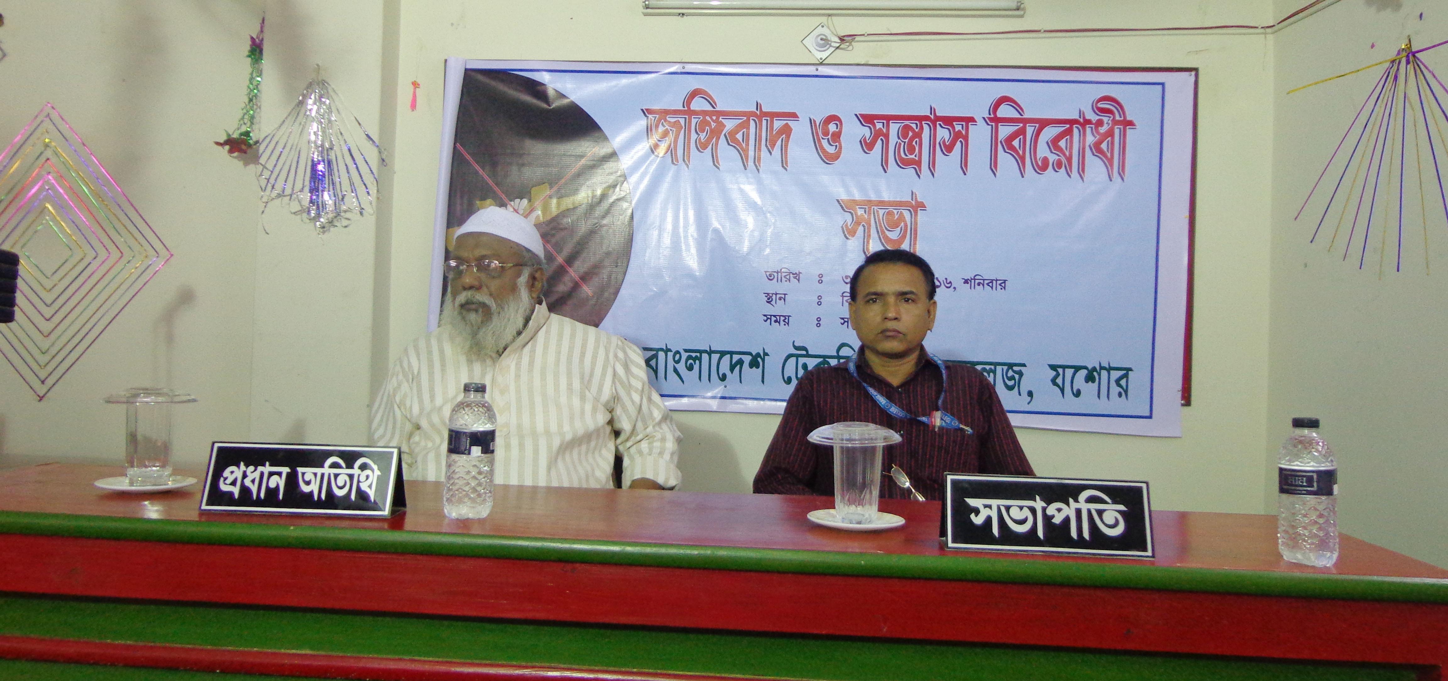 বাংলাদেশ টেকনিক্যাল কলেজের চেয়ারম্যান প্রকৌশলী মোঃ আশরাফুল কবির বলেন , জঙ্গীবাদ নামক বিষাক্ত ছোবলে বাংলাদেশকে ক্ষতিগ্রস্ত করতে চাচ্ছে দেশীয় ও আন্তর্জাতিক শত্রুরা যারা বাংলাদেশের উদীয়মান অর্থনীতি এবং উন্নয়ন দেখে ভীত। তারা জঙ্গীবাদকে সূক্ষভাবে চাপিয়ে দিতে চাচ্ছে বাংলাদেশ ও তার জনগনের উপর যাতে ’৭১ এর পরাজিত শক্তি আরো শক্তিশালী হয়ে উঠতে পারে । তাই এ যুদ্ধে জয়ী হতে হলে সমস্ত অপশক্তির বিরুদ্ধে , জঙ্গীবাদের বিরুদ্ধে সবাইকে ঐক্যবদ্ধ ভাবে রুখে দাঁড়াতে হবে, মনে রাখতে হবে, দেশ ও জাতির উন্নয়নে এবং শান্তি শৃঙ্খলা ও স্থিতি অবস্থা টিকিয়ে রাখার এই যুদ্ধে কোন নিরপেক্ষ জায়গা নেই – জঙ্গীবাদের বিরুদ্ধে সবাইকে অংশ নিতে হবে।