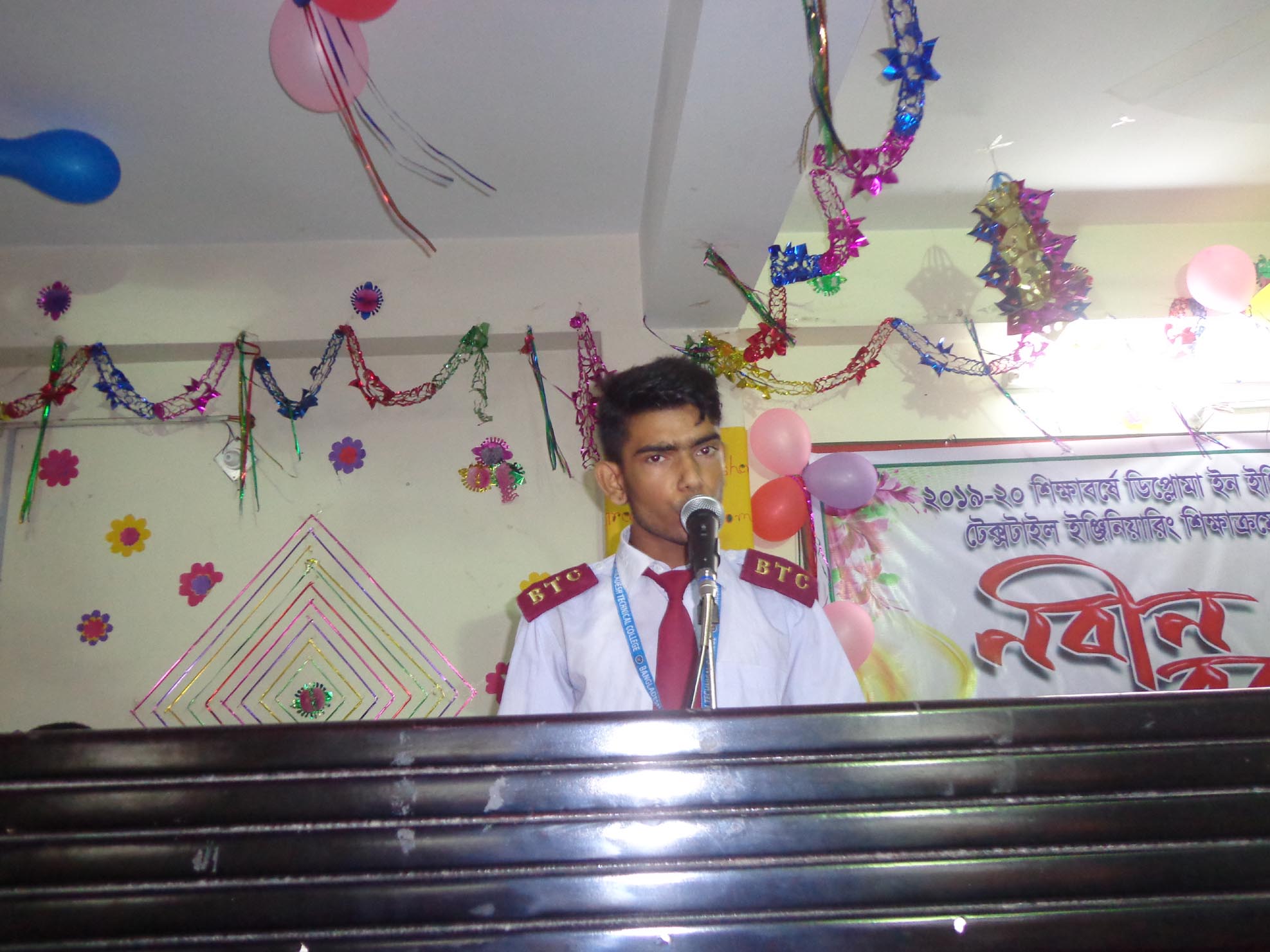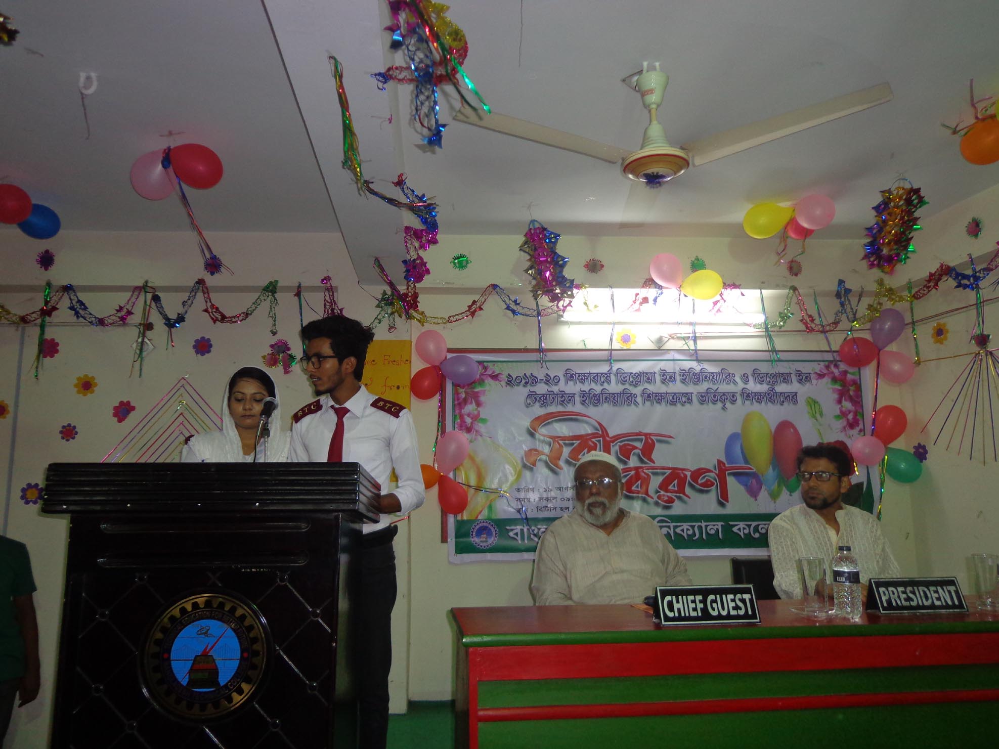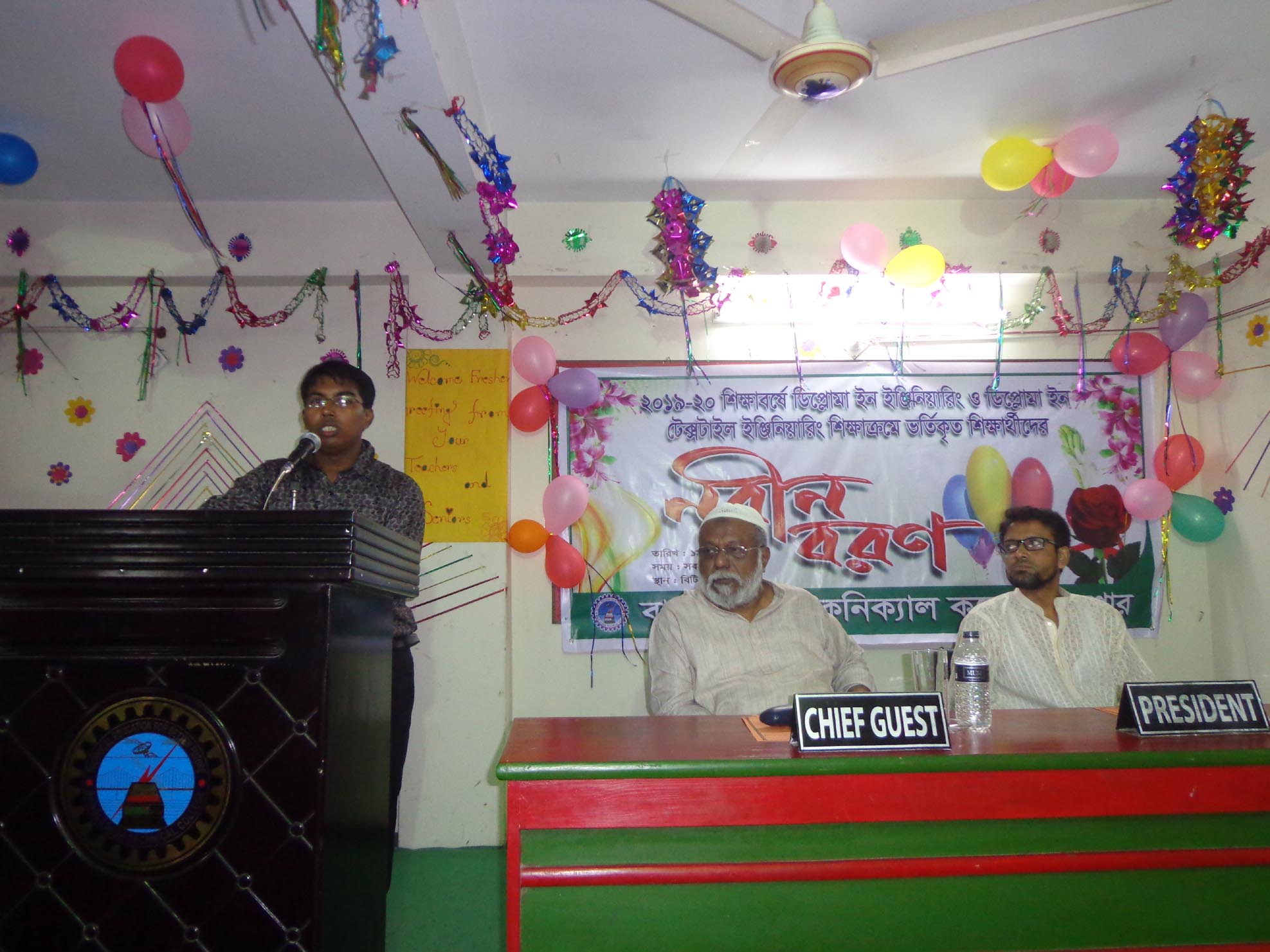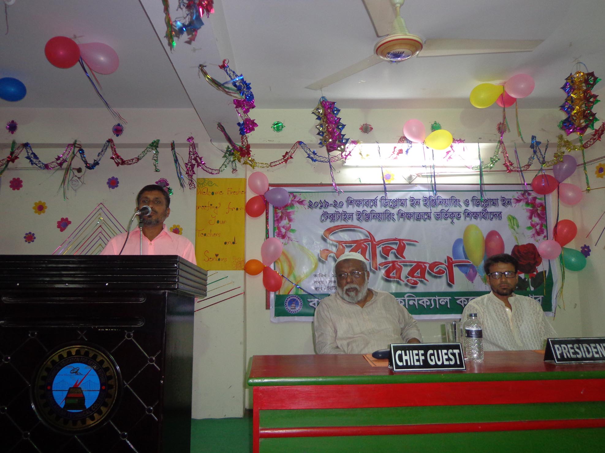 কলেজ অধ্যক্ষ জনাব মোঃ আফজাল হোসেন এর সভাপতিত্বে আয়োজিত নবীনবরণ অনুষ্ঠানে বক্তব্য রাখেন পরীক্ষা নিয়ন্ত্রক মোঃ আবু হুরায়রা, টেক্সটাইল ইঞ্জিনিয়ারিং বিভাগের বিভাগীয় প্রধান প্রকৌশলী প্রদ্যুৎ মল্লিক, সিভিল ইঞ্জিনিয়ারিং বিভাগের বিভাগীয় প্রধান প্রকৌশলী চঞ্চল কুমার বিশ্বাস, কম্পিউটার ইঞ্জিনিয়ারিং বিভাগের বিভাগীয় প্রধান প্রকৌশলী চিন্ময় মজুমদার ইলেকট্রিক্যাল ইঞ্জিনিয়ারিং বিভাগের বিভাগীয় প্রধান প্রকৌশলী এস.এম.বুলবুল আহম্মেদ, এবং নবীনদের মধ্য হতে প্রতিটি বিভাগ থেকে একজন করে শিক্ষার্থী কেউ ইংরেজীতে আবার কেউ বাংলায় তাদের অনুভূতি ব্যক্ত করেন এবং প্রবীণরাও নবীনদের উদ্দেশ্যে তাদের বক্তব্য রাখেন।