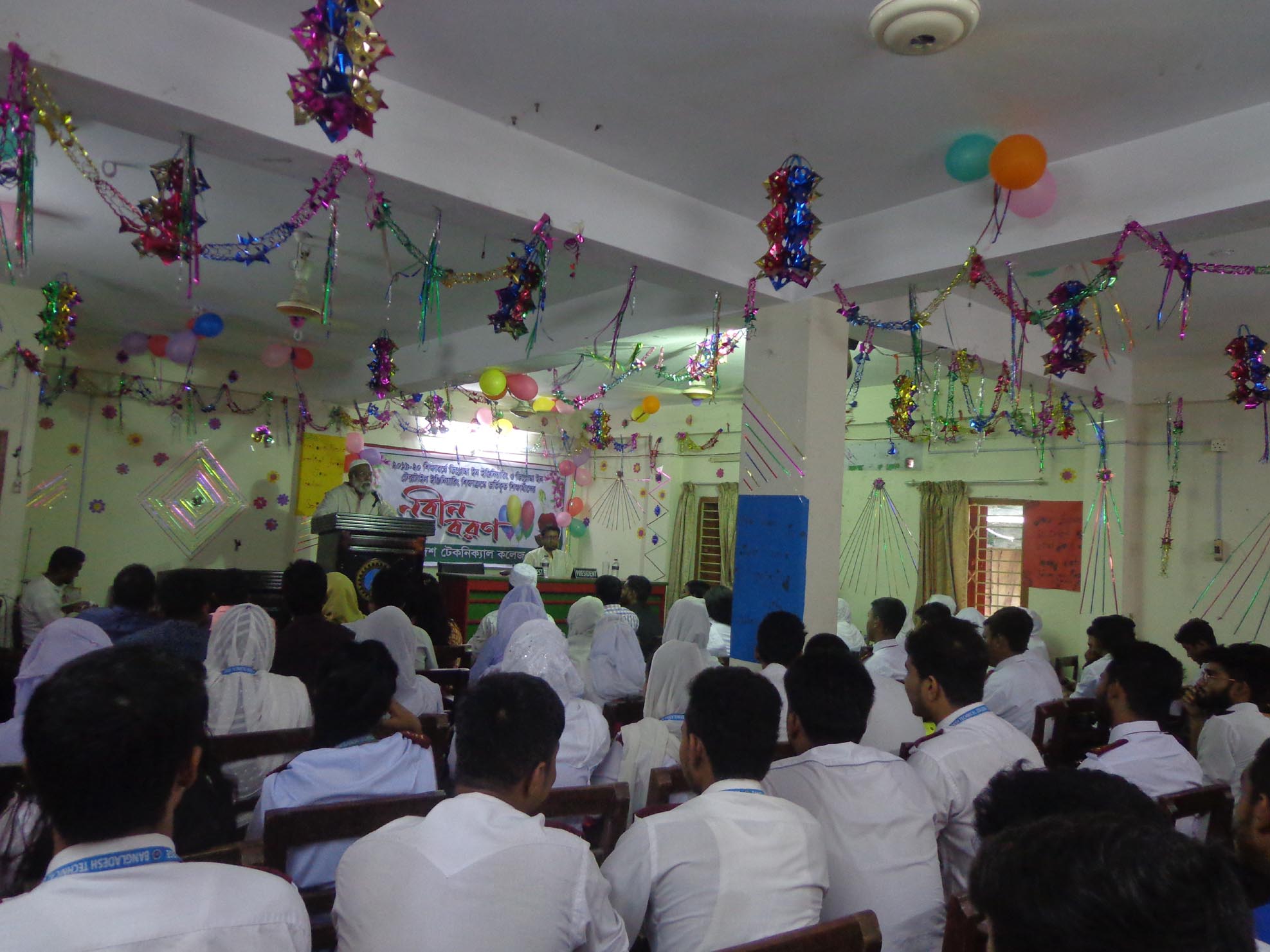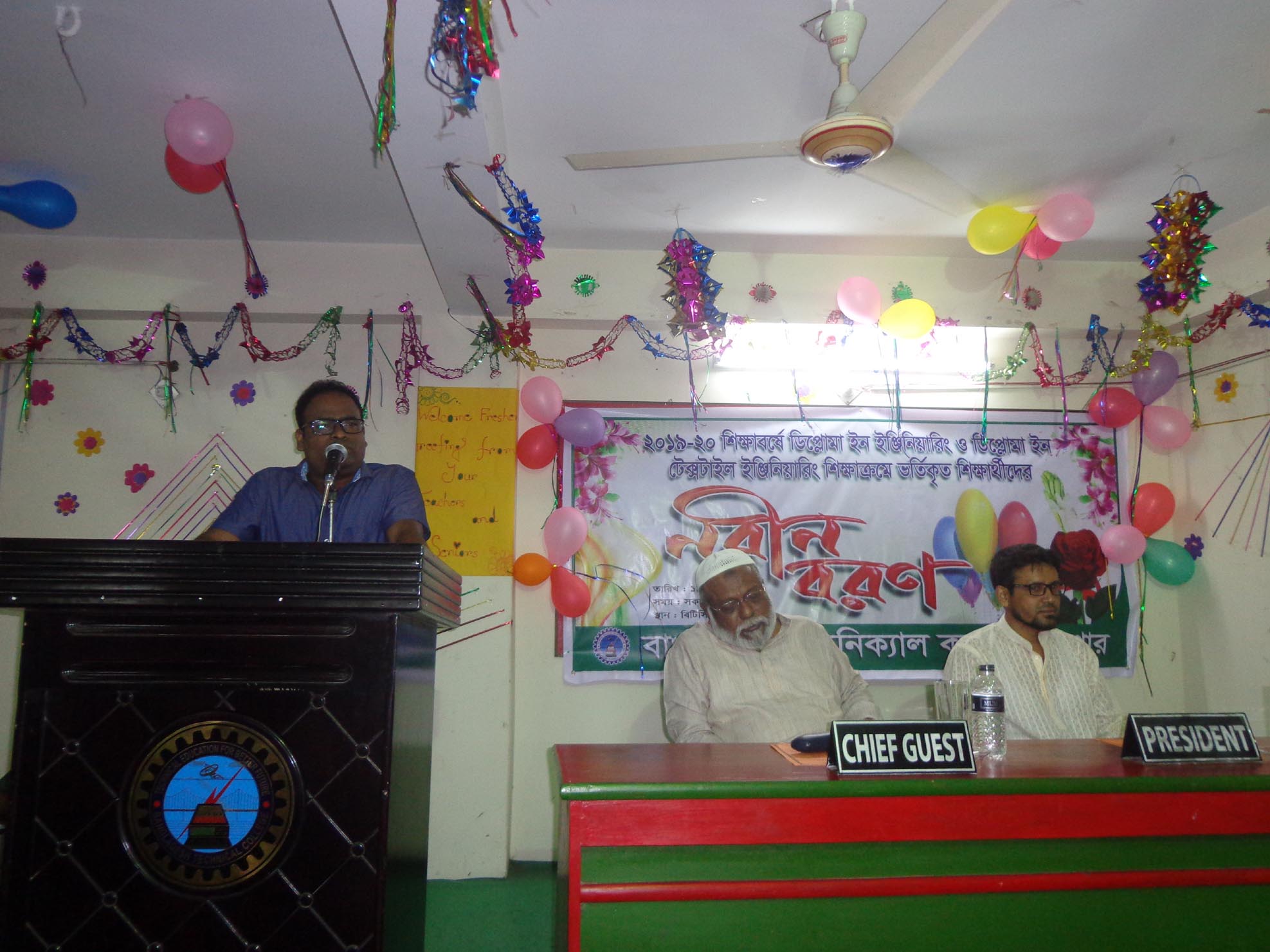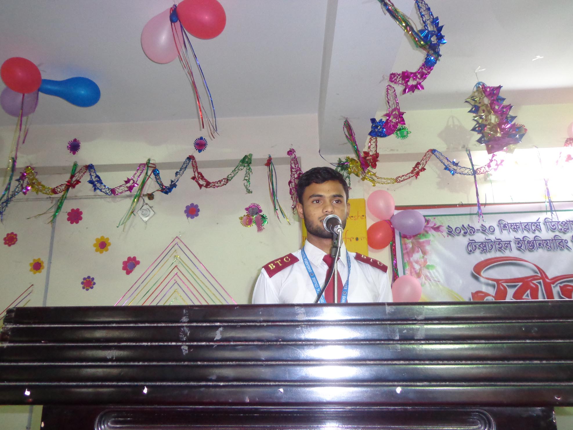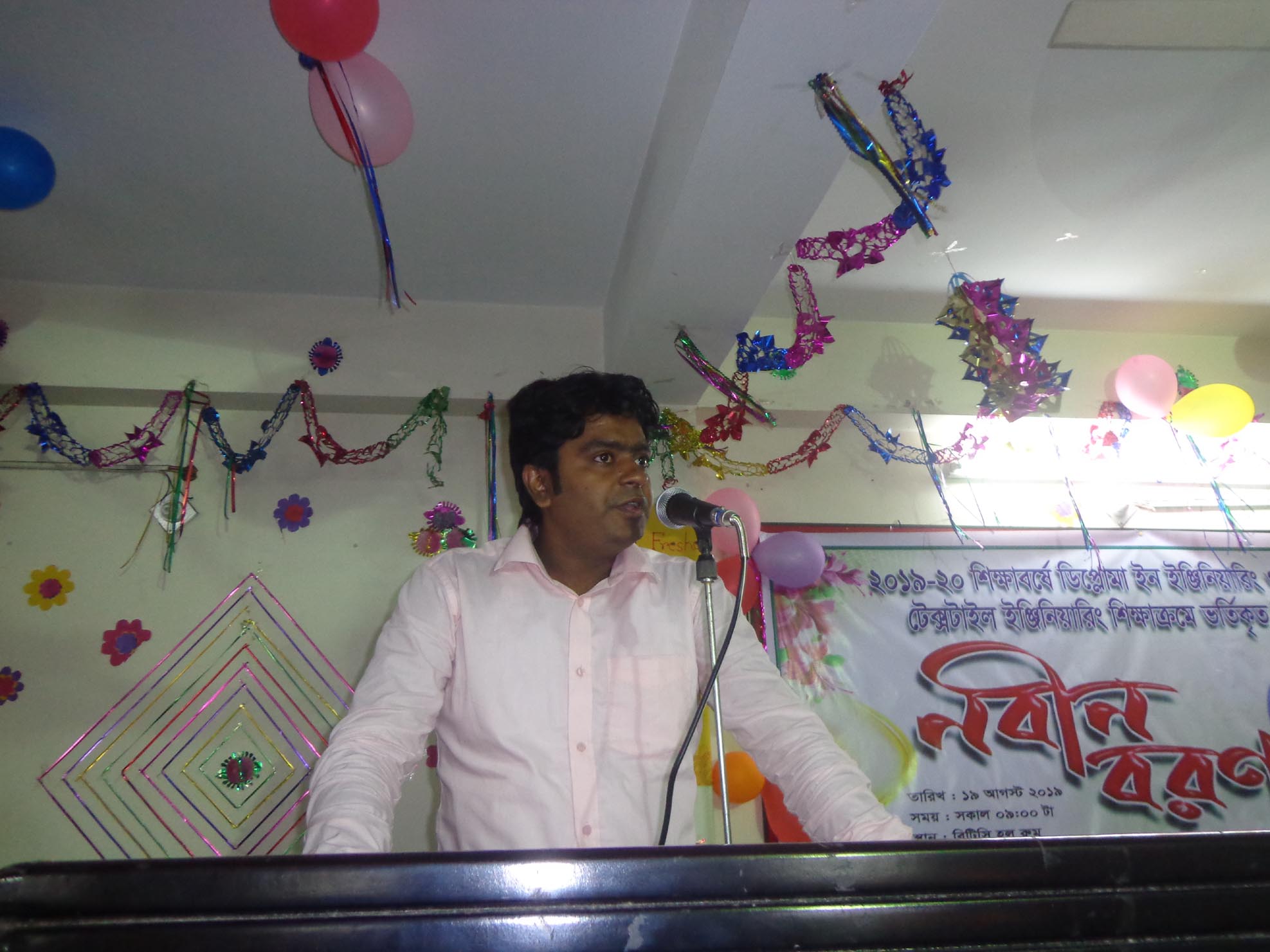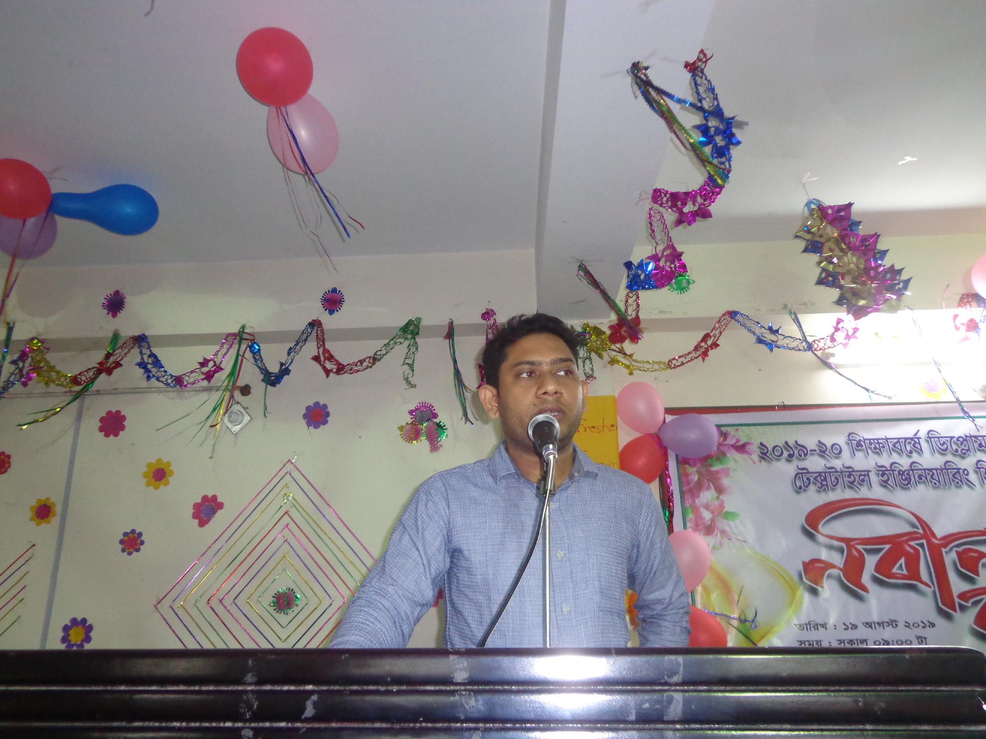 কলেজ অধ্যক্ষ জনাব মোঃ আফজাল হোসেন এর সভাপতিত্বে আয়োজিত নবীনবরণ অনুষ্ঠানে বক্তব্য রাখেন পরীক্ষা নিয়ন্ত্রক মোঃ আবু হুরায়রা, টেক্সটাইল ইঞ্জিনিয়ারিং বিভাগের বিভাগীয় প্রধান প্রকৌশলী প্রদ্যুৎ মল্লিক, সিভিল ইঞ্জিনিয়ারিং বিভাগের বিভাগীয় প্রধান প্রকৌশলী চঞ্চল কুমার বিশ্বাস, কম্পিউটার ইঞ্জিনিয়ারিং বিভাগের বিভাগীয় প্রধান প্রকৌশলী চিন্ময় মজুমদার ইলেকট্রিক্যাল ইঞ্জিনিয়ারিং বিভাগের বিভাগীয় প্রধান প্রকৌশলী এস.এম.বুলবুল আহম্মেদ, এবং নবীনদের মধ্য হতে প্রতিটি বিভাগ থেকে একজন করে শিক্ষার্থী কেউ ইংরেজীতে আবার কেউ বাংলায় তাদের অনুভূতি ব্যক্ত করেন এবং প্রবীণরাও নবীনদের উদ্দেশ্যে তাদের বক্তব্য রাখেন।
