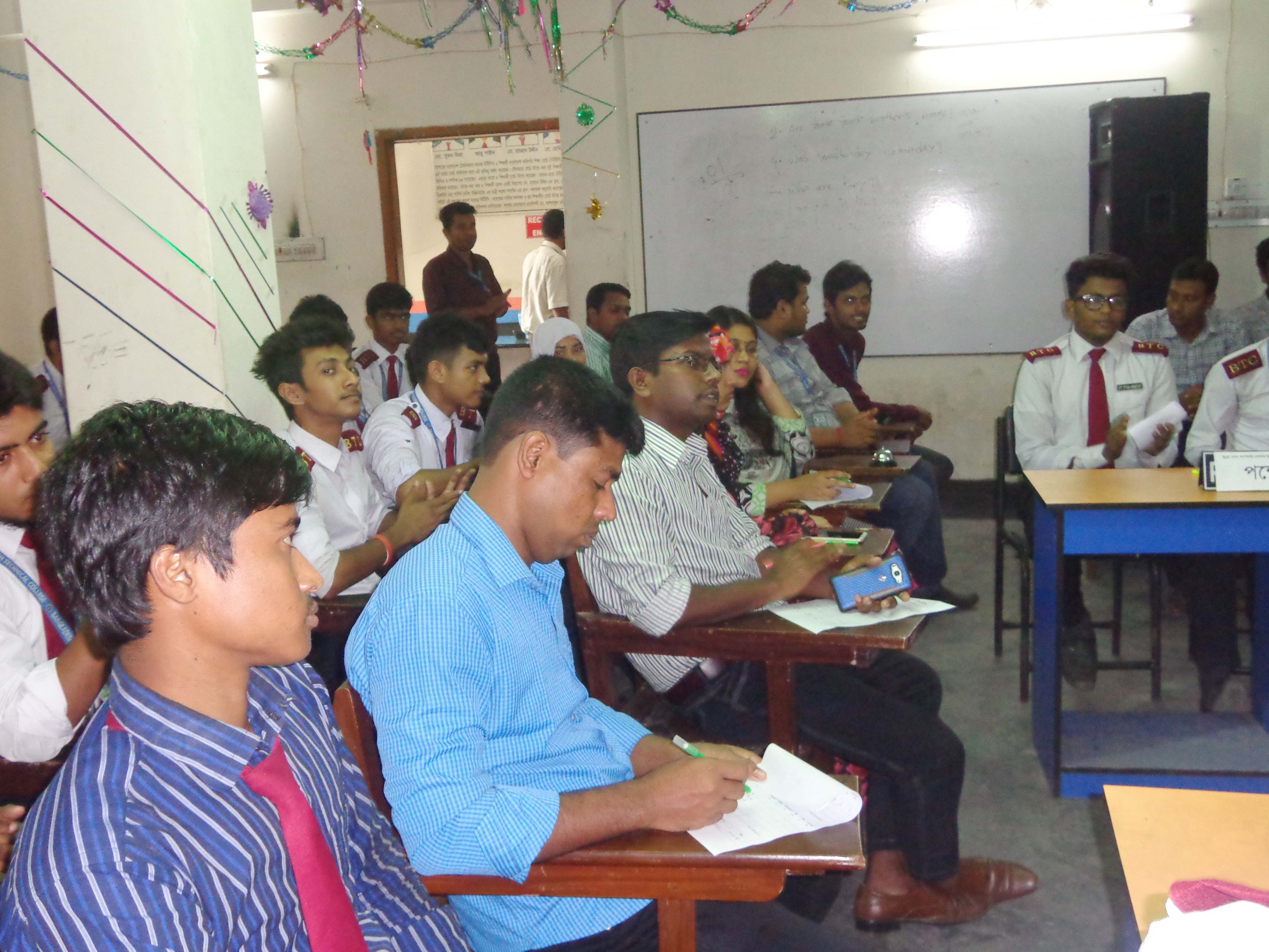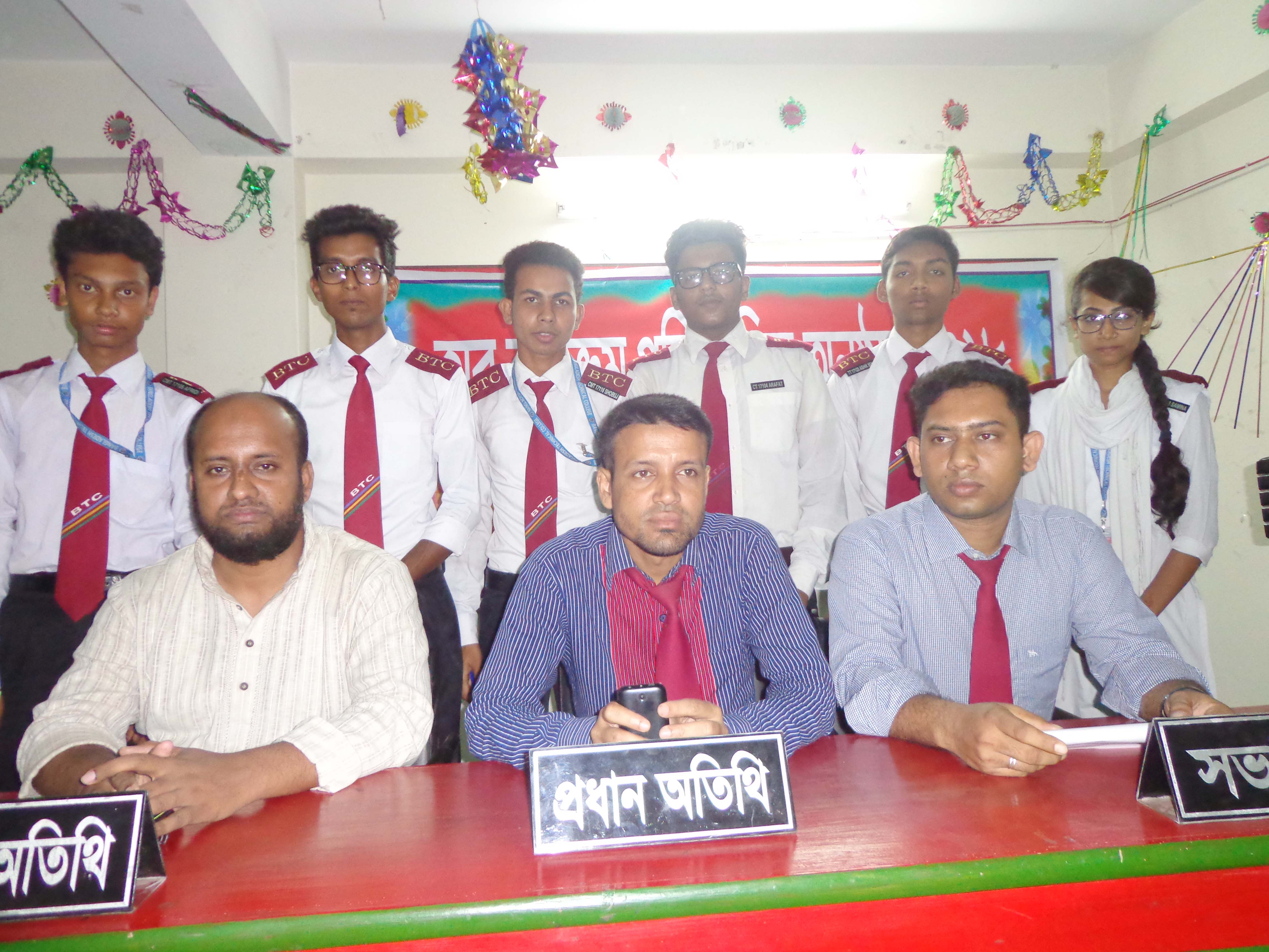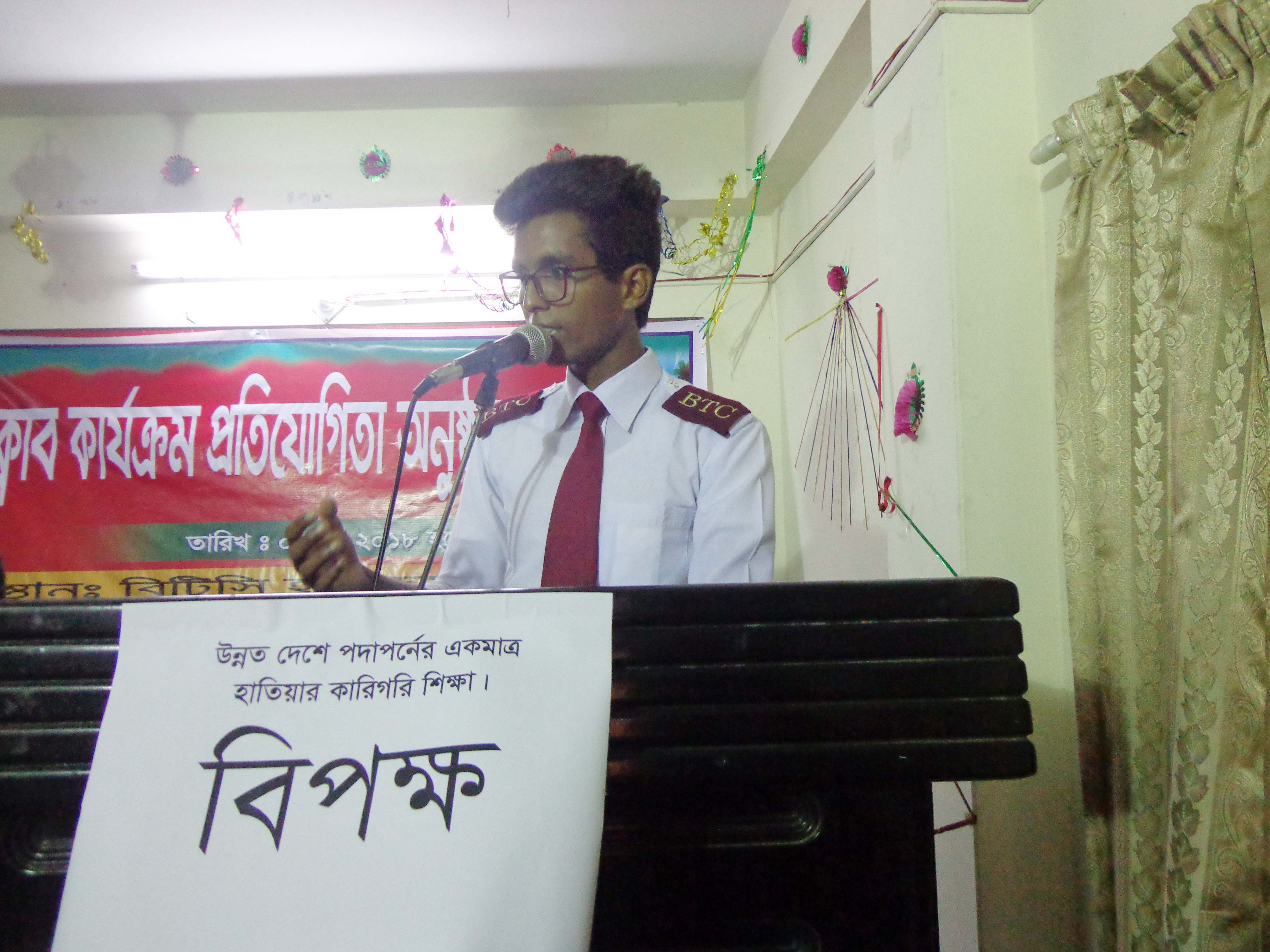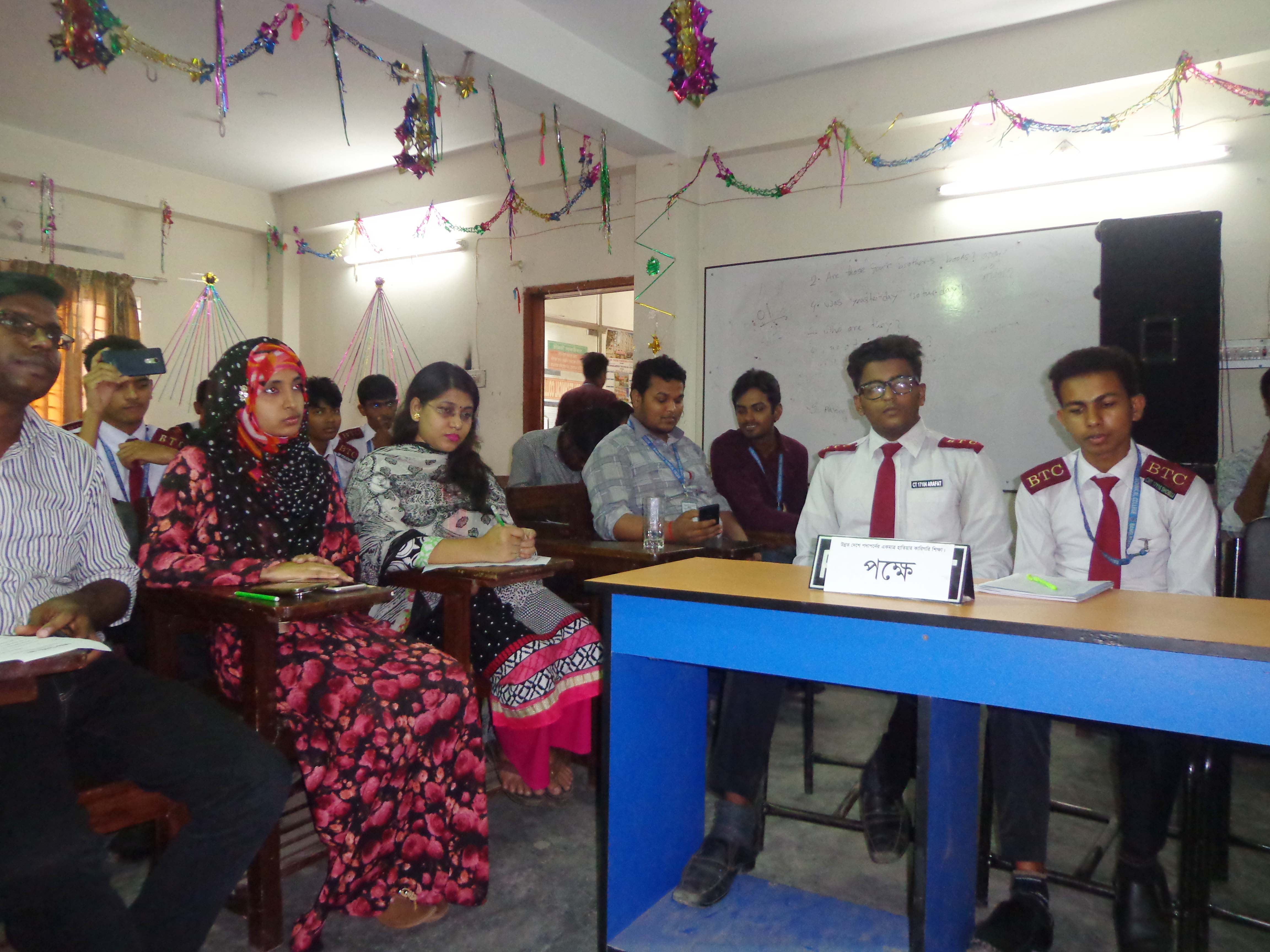 ক্লাব সভাপতি প্রকৌশলী চিন্ময় মজুমদারের সভাপতিত্বে ও  জাহিদুল ইসলাম জাদুর উপস্থাপনায়  অনুষ্ঠিত উক্ত বিতর্ক প্রতিযোগিতায় প্রধান অতিথি হিসেবে উপস্থিত ছিলেন বিটিসি কলেজ অধ্যক্ষ মোঃ আফজাল হোসেন এবং বিশেষ অতিথি হিসেবে উপস্থিত ছিলেন অত্র কলেজের পরীক্ষা নিয়ন্ত্রক মোঃ আবু হুরাইরা। এসময় ক্লাব সচিব আজম আলিসহ অন্যান্য শিক্ষকরা উপস্থিত ছিলেন।অত্যন্ত প্রাণবন্ত এ প্রতিযোগিতা শিক্ষক-শিক্ষার্থীদেরকে মুগ্ধ করে । এ বিতর্ক  প্রতিযোগিতায় পক্ষ দল চাম্পিয়ন হয় । চাম্পিয়ন দলের সদস্যরা হলেন যথাক্রমে মোঃ আরাফাত হোসেন, মোঃ আফ্রিদি হোসেন এবং হোসেন চৌধুরি সবুজ । বিজিত দলের সদস্যরা হলেন যথাক্রমে মোঃ কিফাতউল্লাহ, আশিক মিয়া এবং সামিনা তাসনিম। ।চাম্পিয়ন দলের মোঃ আরাফাত হোসেন শ্রেষ্ঠ বিতার্কিক নির্বাচিত হয়।প্রতিযোগিতায় বিচারকের দায়িত্ব পালন করেন যথাক্রমে সহকারী রেজিস্ট্রার মোঃ নাজমুল আলম, প্রভাষক মোঃ রেজাউল করিম এবং সহকারী রেজিস্ট্রার  নাজমুন্নাহার। উক্ত বিতর্ক প্রতিযোগিতায়  ফলাফল সমন্বয়কের দায়িত্ব পালন করেন কম্পিউটার বিভাগের প্রধান প্রকৌশলী জি এম ইসরাফীল ইসলাম।